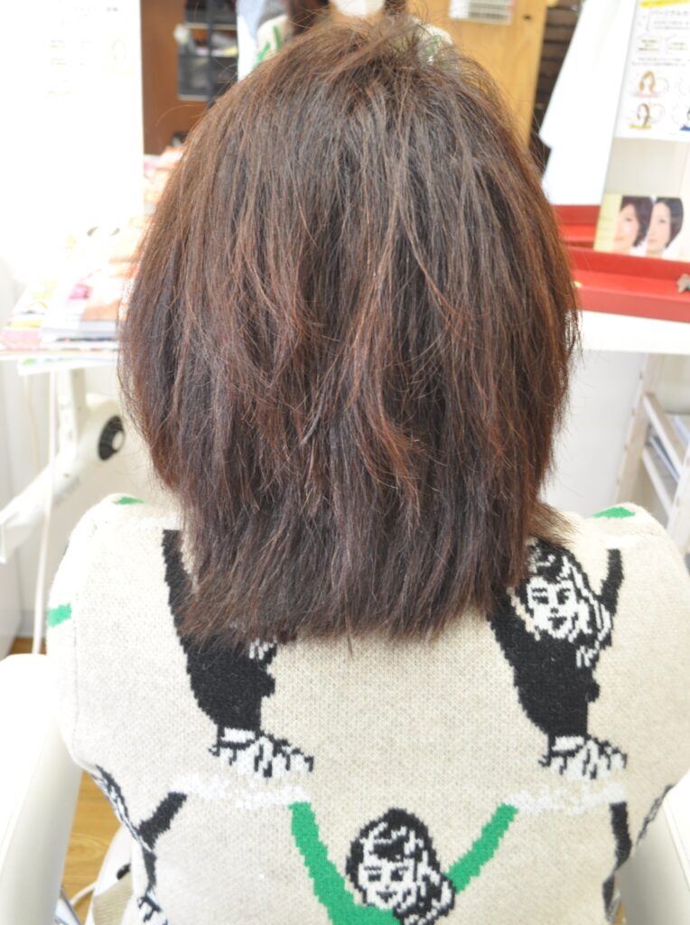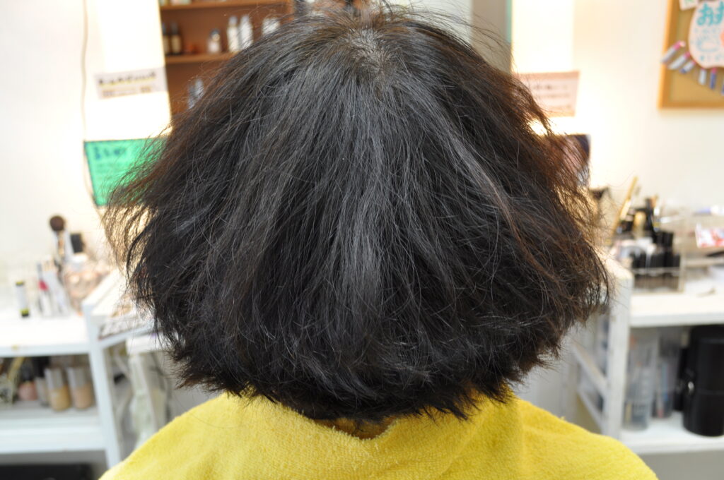 縛れる長さがないと不安…でも短いスタイルにも憧れがある…というゲストさん。頻繁に行うグレーカラーでのパサつきもあり、もともとあるジャリジャリとしたくせ毛と多毛がより膨張したようにみせまとまりも悪く見えます。クセ毛によりパサついた印象にもみえます。