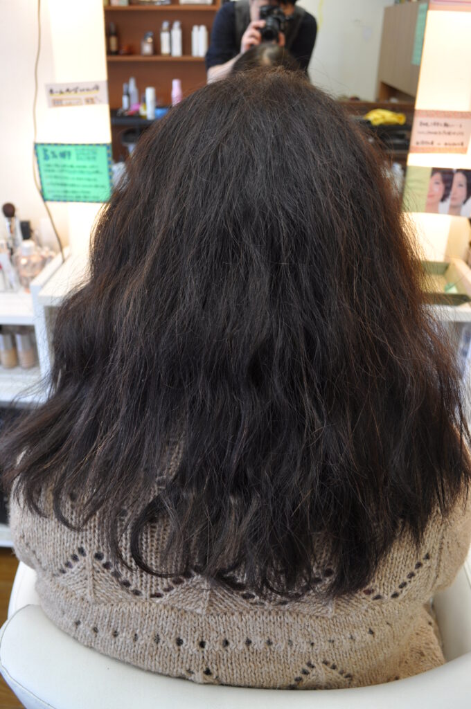 何十年もヘアスタイルチェンジできていなかったゲストさんです。髪質は太すぎず細すぎないのですが、量が多めです。クセ自体は波を打ったような波状毛タイプのくせ毛さん。短く切るとクセが出てきそうな気配を感じます。そういった理由からもなかなかスタイルを変えることが出来ないでいたんでしょうね…こちらのゲスト様も、担当してくれた美容師さんにスタイルチェンジを希望してもいい顔されなかったそうでこの時は、自分の髪質のせいなんだ…くせ毛だから諦めるしかないんだ…とスタイルチェンジなどイメージすらできないでおりました。