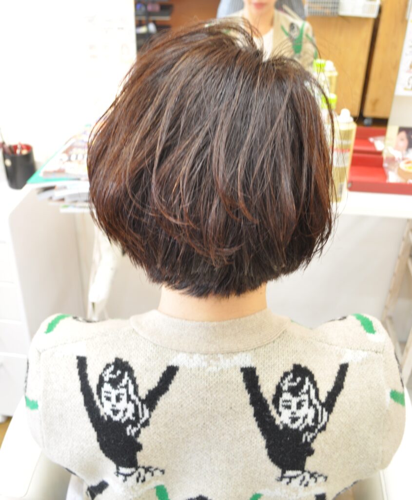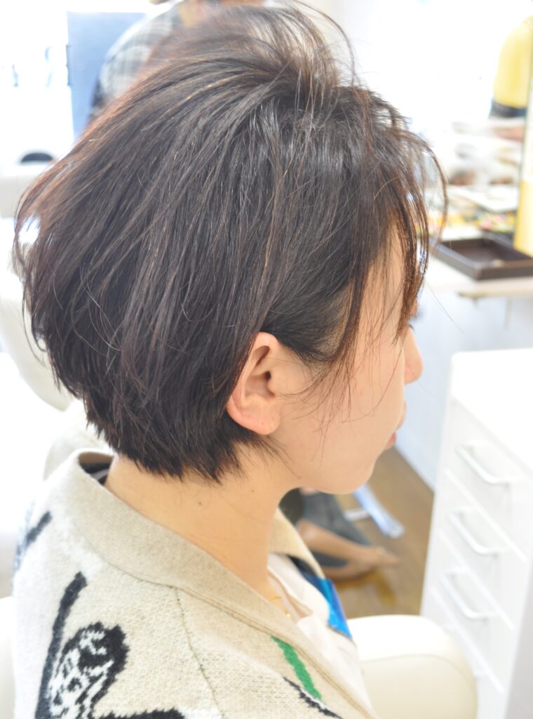 ただ、短いスタイルでピンピンとなりすぎてしまうとf自然でかえって扱いにくくなるため、その辺りは加減が必要です‼ブローやアイロン等無しでも自然なフォルムになるように、まとまりの良いスタイルになるようイメージしカットと縮毛矯正でバランスをとりました。