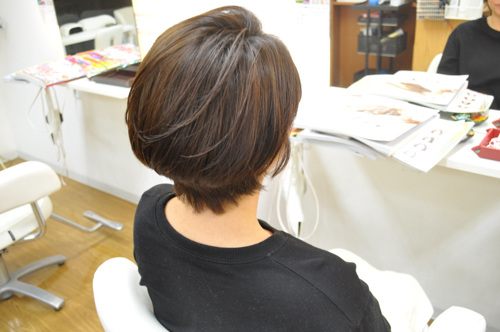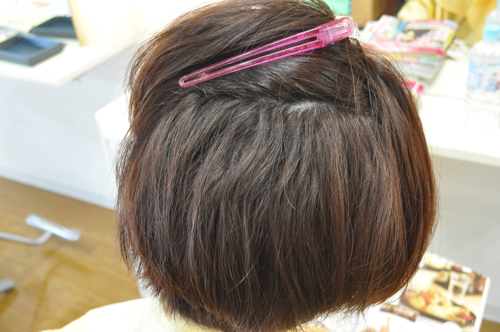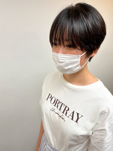 クセもそこそこあり、多毛さん質感もやや硬めの方です。他店で以前ショートスタイルを相談したところ断られた経験があるゲストさんですが、ダンの入れ方と削ぎを合わせ形と毛量を調整し、縮毛矯正で強めのクセを整え、全体のシルエットを調整していきます。クセが強めの場合に起こりうる不自然なツンツン…そんな質感にならないように、薬剤とアイロンワークのバランスは注意することは必要になります。